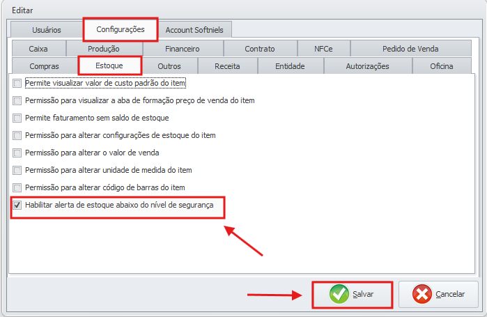 Selecione a aba Configurações > Estoque>Marque o checkbox da opção “Habilitar alerta de estoque abaixo do nível de segurança”.