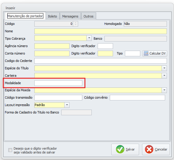 No campo Modalidade adicione a informação da variação da carteira informada pelo banco.