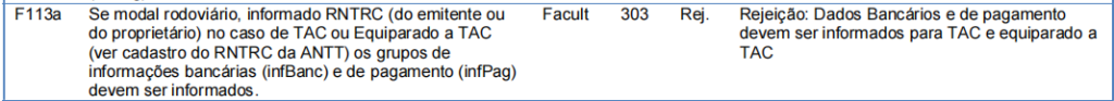 Se o transporte for rodoviário e houver RNTRC informado (do emitente ou do proprietário do veículo) — quando for TAC ou Equiparado a TAC — então é obrigatório preencher as informações bancárias e de pagamento conforme descrito na Nota Técnica 2025.001: