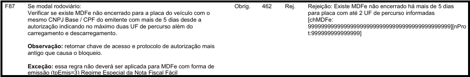 A rejeição está prevista nas Regras de Validação do MDF-e, que determinam que um MDF-e não pode permanecer aberto por mais de 5 dias nessas condições, impedindo a emissão de novos documentos para a mesma placa até que o anterior seja devidamente encerrado.