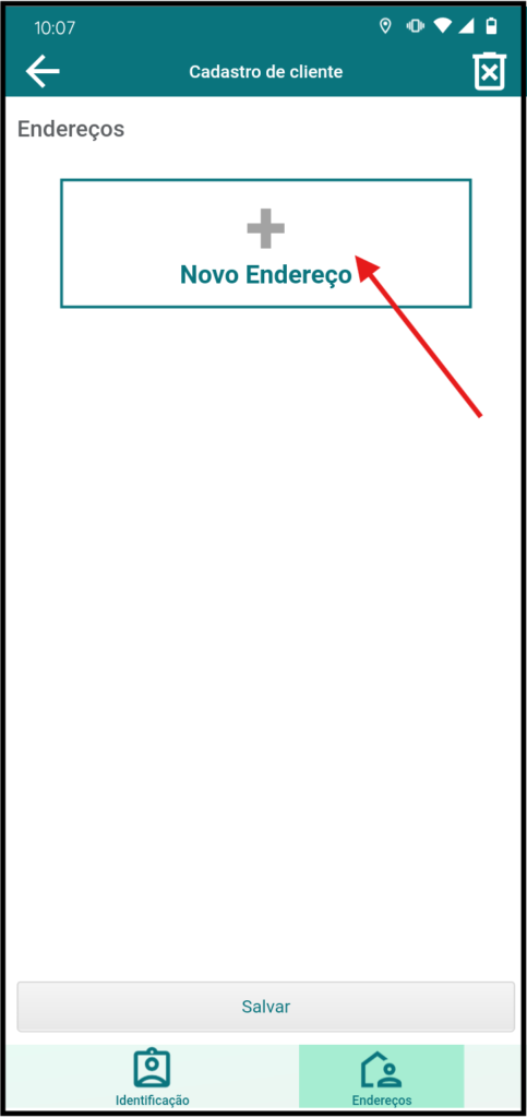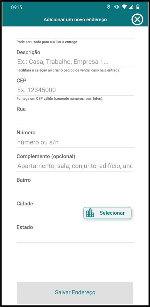 Abaixo dos dados cadastrais, clique no botão “Endereço”. Depois selecione “Novo Endereço” para incluir as informações.