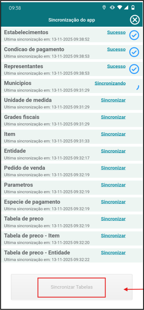 Após configurar o servidor, é importante sincronizar as tabelas do aplicativo para garantir que todas as informações estejam atualizadas.