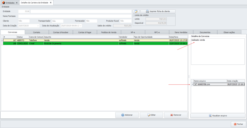 Nesta aba estarão listada todas as conversas registradas para a entidade selecionada.