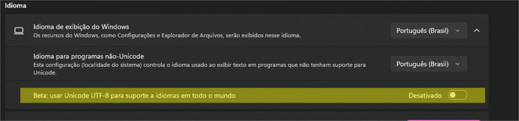 Possível solução : Pesquise por “Configurações de Idioma” na barra de pesquisa do Windows. Na janela que será aberta, clique na seta para expandir as opções avançadas e verifique se a função “Beta: Usar Unicode UTF-8 para suporte a idiomas em todo o mundo” está ativada