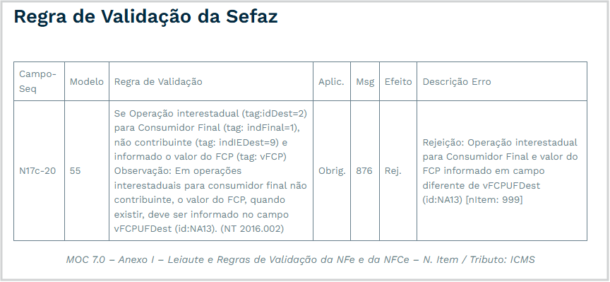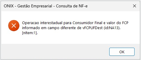 A rejeição NA13 ocorre quando, em uma operação interestadual para consumidor final, o valor do FCP (Fundo de Combate à Pobreza) é informado em campo incorreto no XML da NF-e.