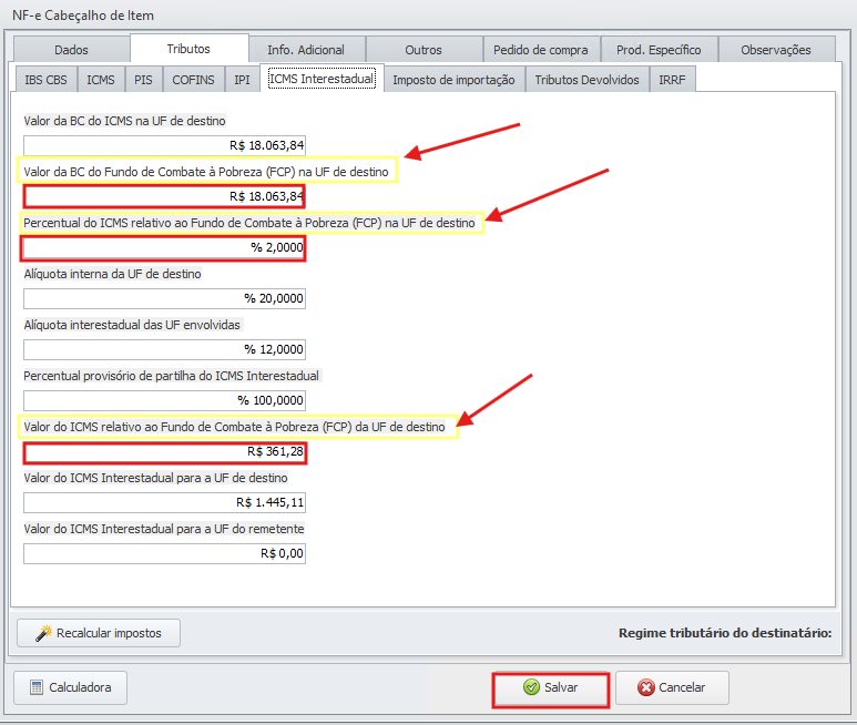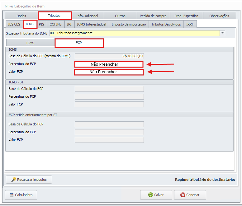 Para que o erro não ocorra na NF-e, edite o item e acesse Cabeçalho > Tributos > ICMS > FCP. Nessa tela, os campos Percentual de FCP e Valor de FCP não devem estar preenchidos, caso esteja preenchido, apagar.