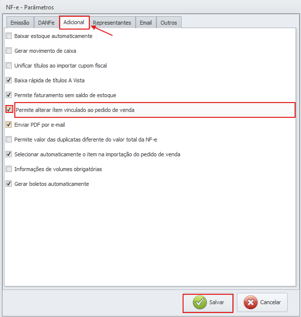 Para habilitar o parâmetro – Manutenção>NFe Nota Fiscal Eletrônica>NFe Parâmetros>Editar> aba Adicional, selecione o parâmetro e clique em salvar .
