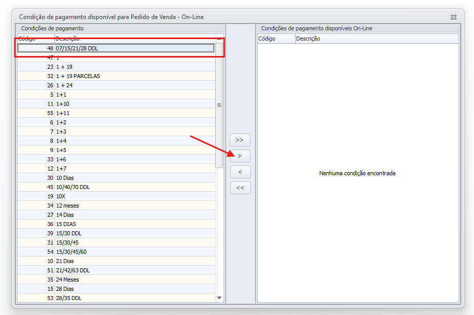 Selecione a condição de pagamento que deseja disponibilizar para vendas no pedido de venda, e clique na seta apontada para a direita, como mostrado na imagem.